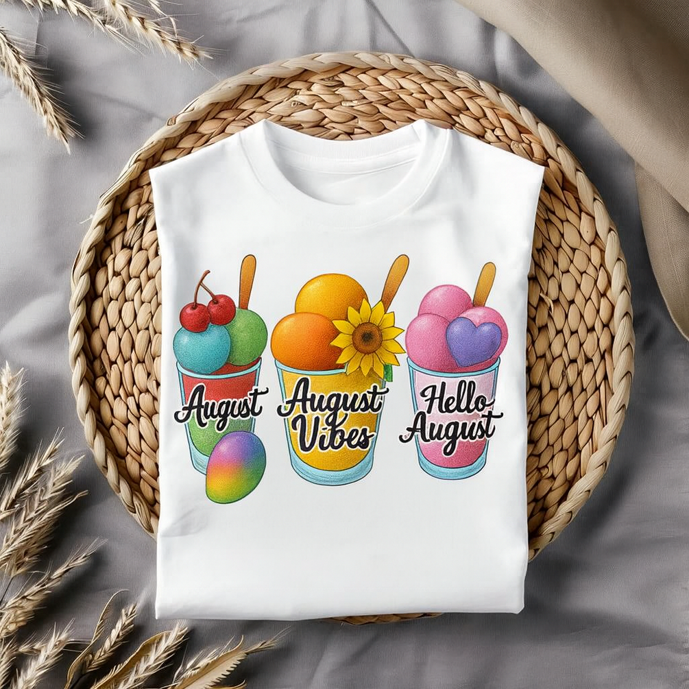 Celebrate the joy of summer with this exclusive "August Vibes" Digital PNG Design! Featuring three vibrant sorbet cups topped with fruits, sun flowers, and hearts, this playful artwork is perfect for August-themed t-shirts, mugs, tote bags, wall art, and more.